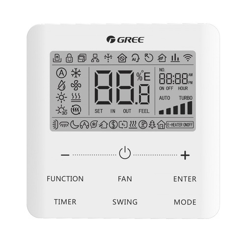 Проводной пульт управления GREE XE7A-24/H предназначен для использования с полупромышленными и мультизональными (VRF) системами кондиционирования GREE. Он не совместим с бытовыми настенными сплит-системами. Этот пульт используется в первую очередь с полупромышленными кассетными, канальными и напольно-потолочными блоками.