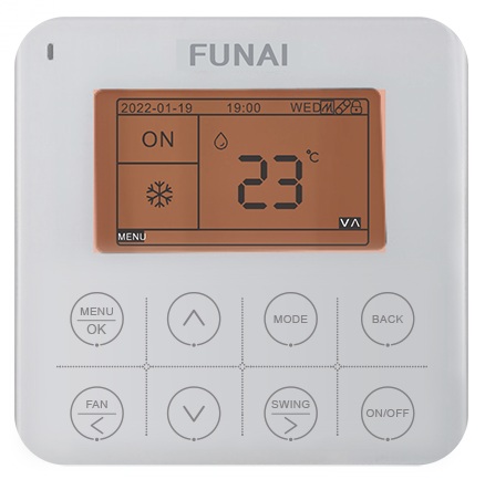 Проводной пульт управления FUNAI RW-02 предназначен для настройки и управления полупромышленными сплит-системами FUNAI серий DRAGON и ORIGAMI KODO. Он служит основным интерфейсом для контроля параметров работы кондиционера в коммерческих или жилых помещениях.