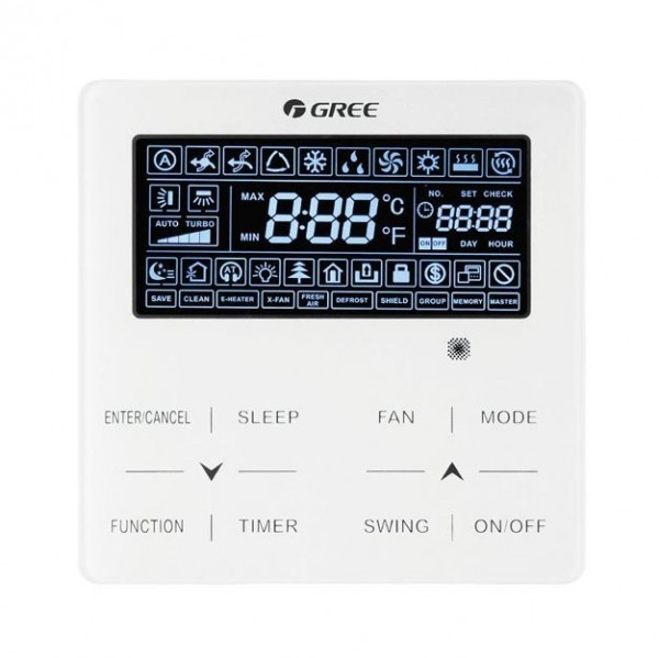 Проводной пульт управления GREE XE73-44/E для внутренних блоков систем кондиционирования Gree, оснащенный большим ЖК-дисплеем с черным фоном и белыми значками и сенсорными кнопками. Он предоставляет расширенные возможности контроля над параметрами микроклимата и совместим с широким спектром внутренних блоков, в частности, с канальными блоками VRF.