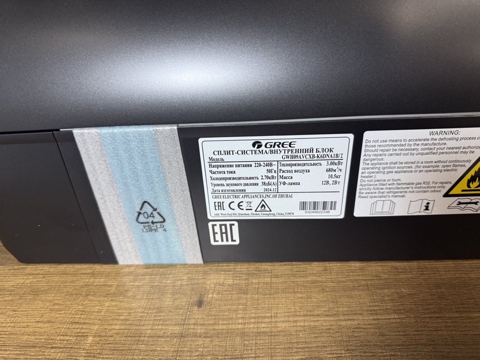 Сплит-система GREE GWH09AVCXB-K6DNA1B(black) серии AIRY INVERTER R32 BLACK обладает инверторным компрессором мощностью 2.7 кВт и способен охладить помещение площадью до 25 м2. Уровень шума внутреннего блока 19 дБ.