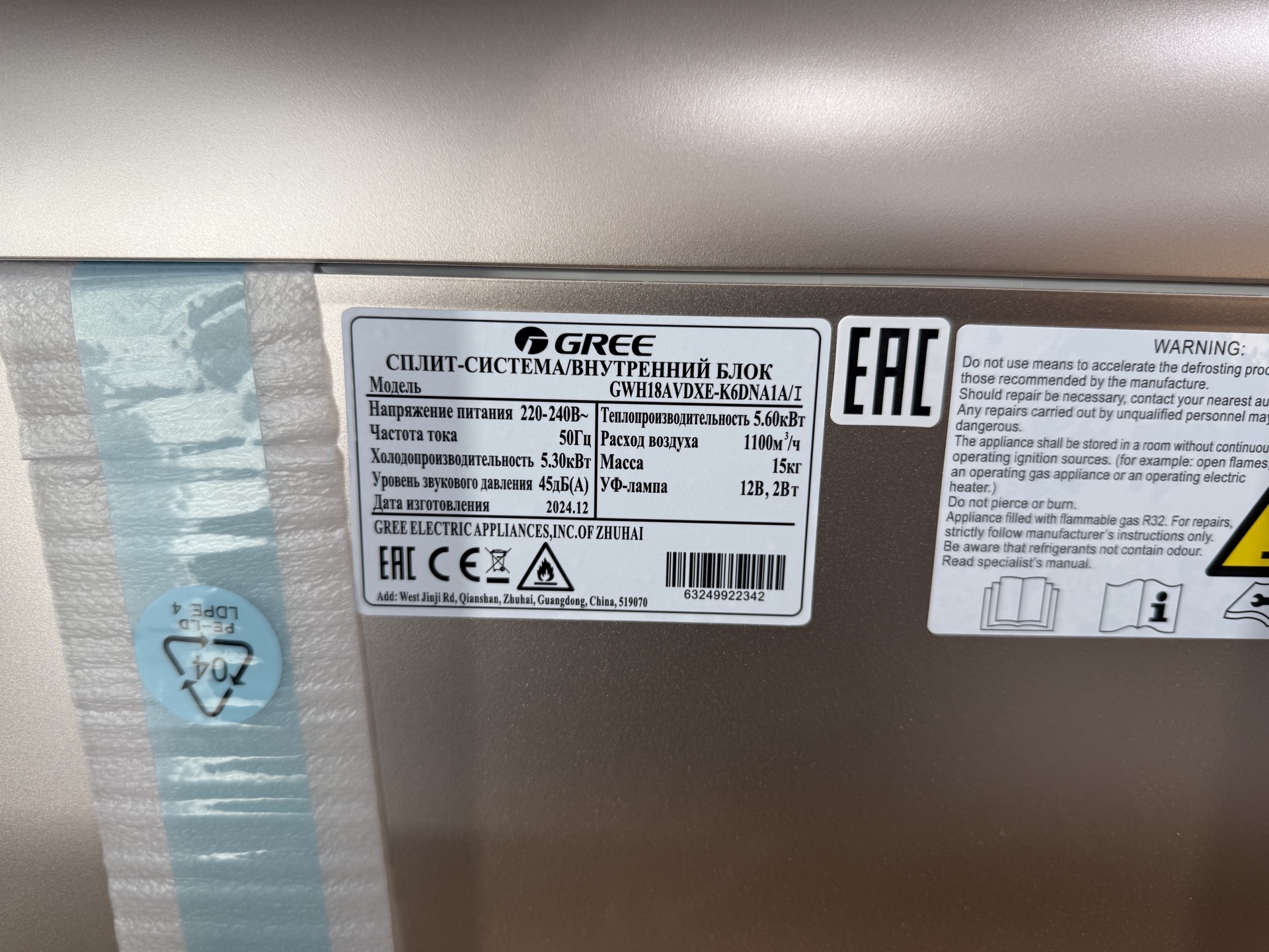 Сплит-система GREE GWH18AVDXE-K6DNA1A(champagne) серии AIRY INVERTER R32 CHAMPAGNE обладает инверторным компрессором мощностью 5.3 кВт и способен охладить помещение площадью до 50 м2. Уровень шума внутреннего блока 23 дБ.