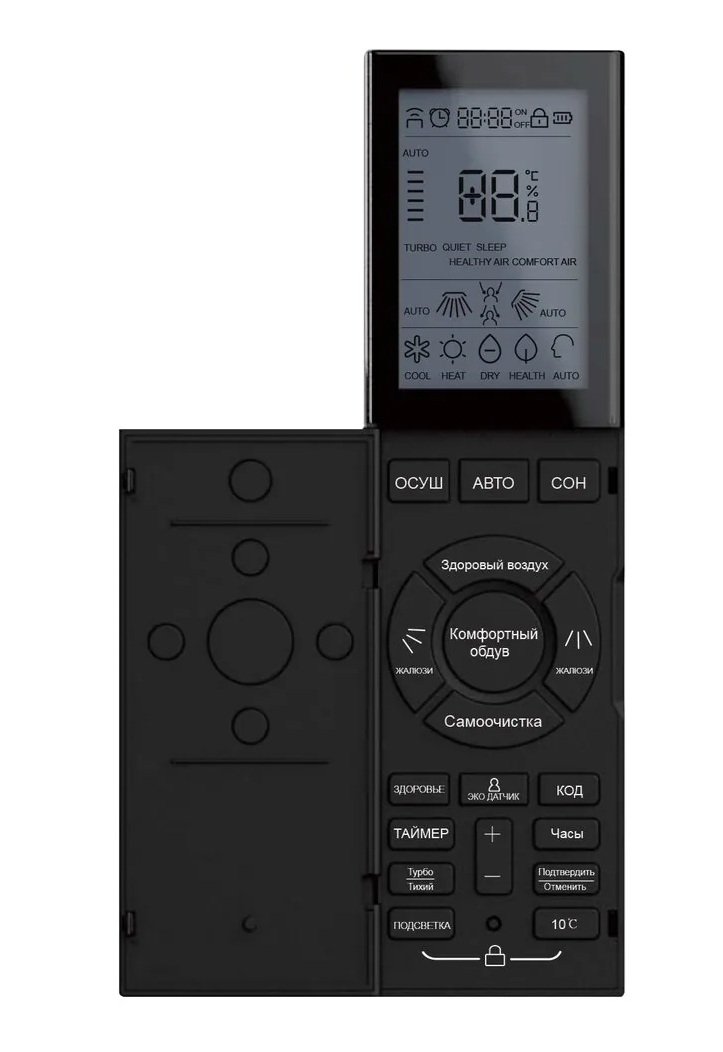 Многофункциональный пульт ДУ: Эргономичный пульт с большим ЖК-дисплеем, на котором отображаются все режимы, температура, таймер, направление воздушного потока и уровень заряда батареек. Предусмотрена блокировка кнопок от детей.
