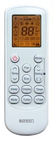 Пульт дистанционного управления (в комплекте) позволяет выбирать режимы работы, регулировать температуру, скорость вентилятора, настраивать таймер, активировать функции TURBO, ECO, SLEEP, SWING, I FEEL, HEALTH, MUTE и отключать дисплей.