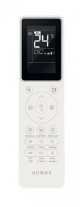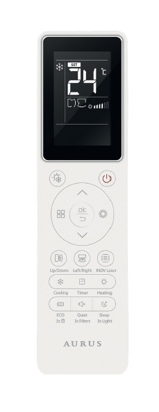 Пульт оснащен большим дисплеем, подсветкой кнопок, отдельными клавишами для управления горизонтальными и вертикальными жалюзи, регулировкой яркости дисплея внутреннего блока и пятью скоростями вентилятора.