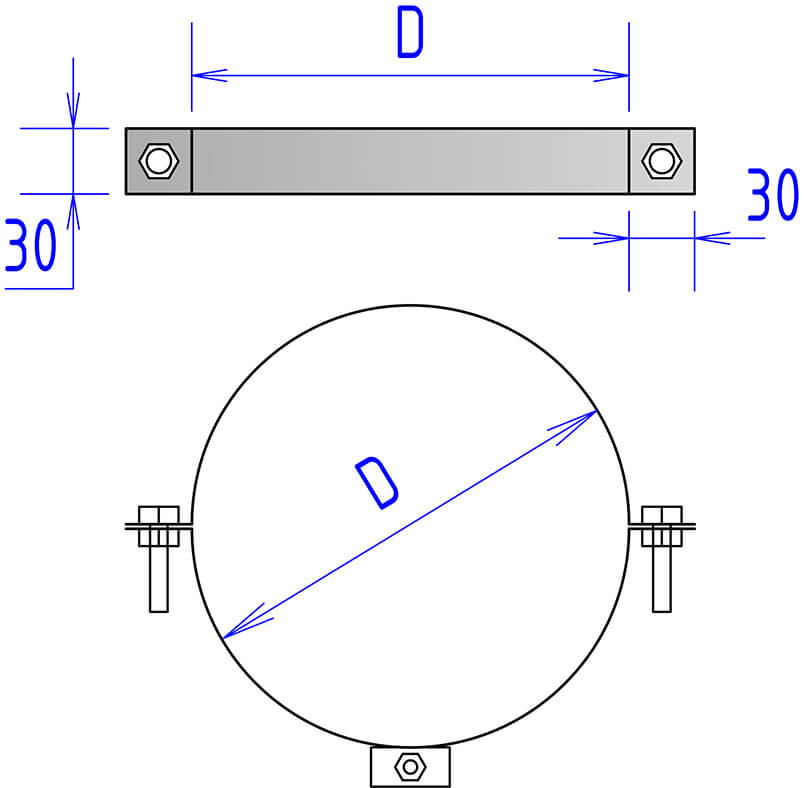 Хомут для телескопического кронштейна диаметром 300 мм изготовлен из нержавеющей стали марки AISI 430 толщиной 1.5 мм охватывает наружный диаметр элемента дымохода, а его конструкция позволяет соединяться с телескопической частью кронштейна для регулировки вылета от стены. Состоит из двух полукруглых частей с монтажными отверстиями затягивается посредством болтов и гаек, которые идут в комплекте. Подходит для элементов дымохода с диаметром 300 мм.