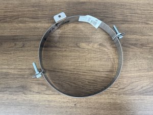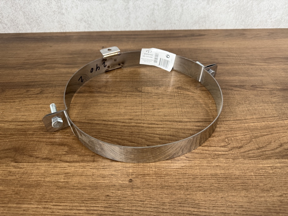 Хомут для телескопического кронштейна диаметром 240 мм изготовлен из нержавеющей стали марки AISI 430 толщиной 1.5 мм охватывает наружный диаметр элемента дымохода, а его конструкция позволяет соединяться с телескопической частью кронштейна для регулировки вылета от стены. Состоит из двух полукруглых частей с монтажными отверстиями затягивается посредством болтов и гаек, которые идут в комплекте. Подходит для элементов дымохода с диаметром 240 мм.