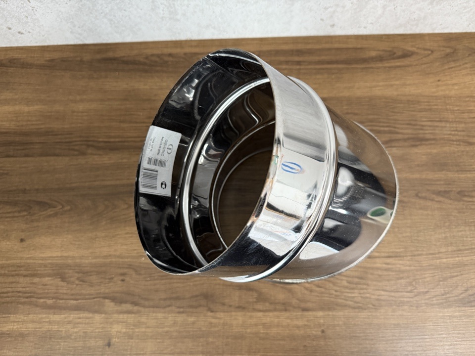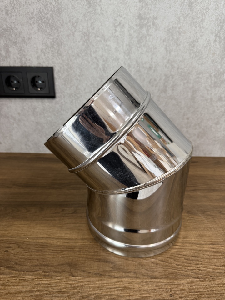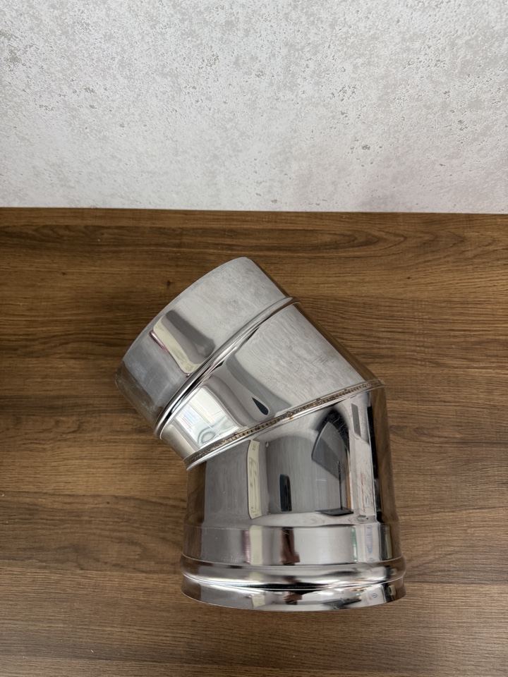 Одностенный отвод, колено или угол 45 градусов из нержавеющей стали диаметром 180 мм элемент дымохода для изменения направления трубы (горизонтально или вертикально), обхода препятствий, например, стропил или балок перекрытия. Изготавливаются из жаростойкой нержавеющей стали AISI 430, толщиной 0.5 мм, сварные швы обеспечивают герметичность и устойчивость к конденсату.