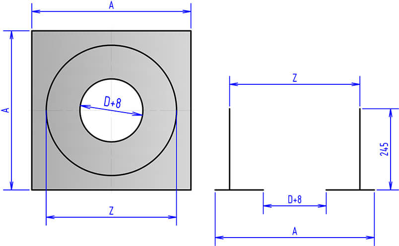 Потолочный проходной узел ППУ модель №1 с отверстием диаметром 230 мм защитный элемент дымоходной системы, предназначенный для безопасного прохождения трубы через горючие потолочные перекрытия и стены. Он предотвращает возгорание деревянных конструкций за счет изоляции горячей трубы негорючими материалами (минерит, базальтовая вата).