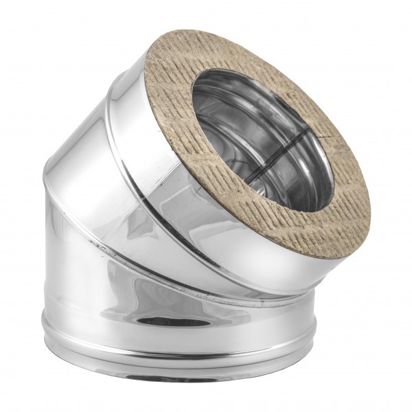 Отвод 2ОТ 45 115 / 200 мм из нержавеющей стали марки AISI 430 элемент модульной утепленной (сэндвич) системы дымохода, предназначенный для изменения направления дымовой трубы на 45° для обхода препятствий при монтаже системы отведения продуктов сгорания от котлов, печей или каминов. Он состоит из внутренней и внешней трубы с теплоизоляционным материалом толщиной 30 мм между ними.