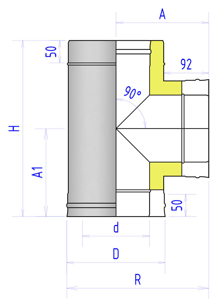 Тройник 2ТР 90 300 / 400 мм элемент двухстенного (сэндвич) дымохода с углом отвода 90 градусов, изготовлен из нержавеющией стали марки AISI 430, толщина внутренней и наружней стенок 0.5 мм, между внутренним и внешним контурами находится слой 50 мм изоляционного материала (негорючая базальтовая вата). Предназначен для соединения дымоотводящей трубы от печи или котла с основным вертикальным каналом дымохода под углом 90 градусов.