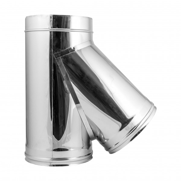 Тройник 2ТР 45 250 / 350 мм это элемент двухстенного (сэндвич) дымохода с углом отвода 45 градусов, изготовлен из нержавеющией стали марки AISI 430, толщина внутренней стенки 1 мм и наружней 0.5 мм, между внутренним и внешним контурами находится слой 50 мм изоляционного материала (негорючая базальтовая вата).