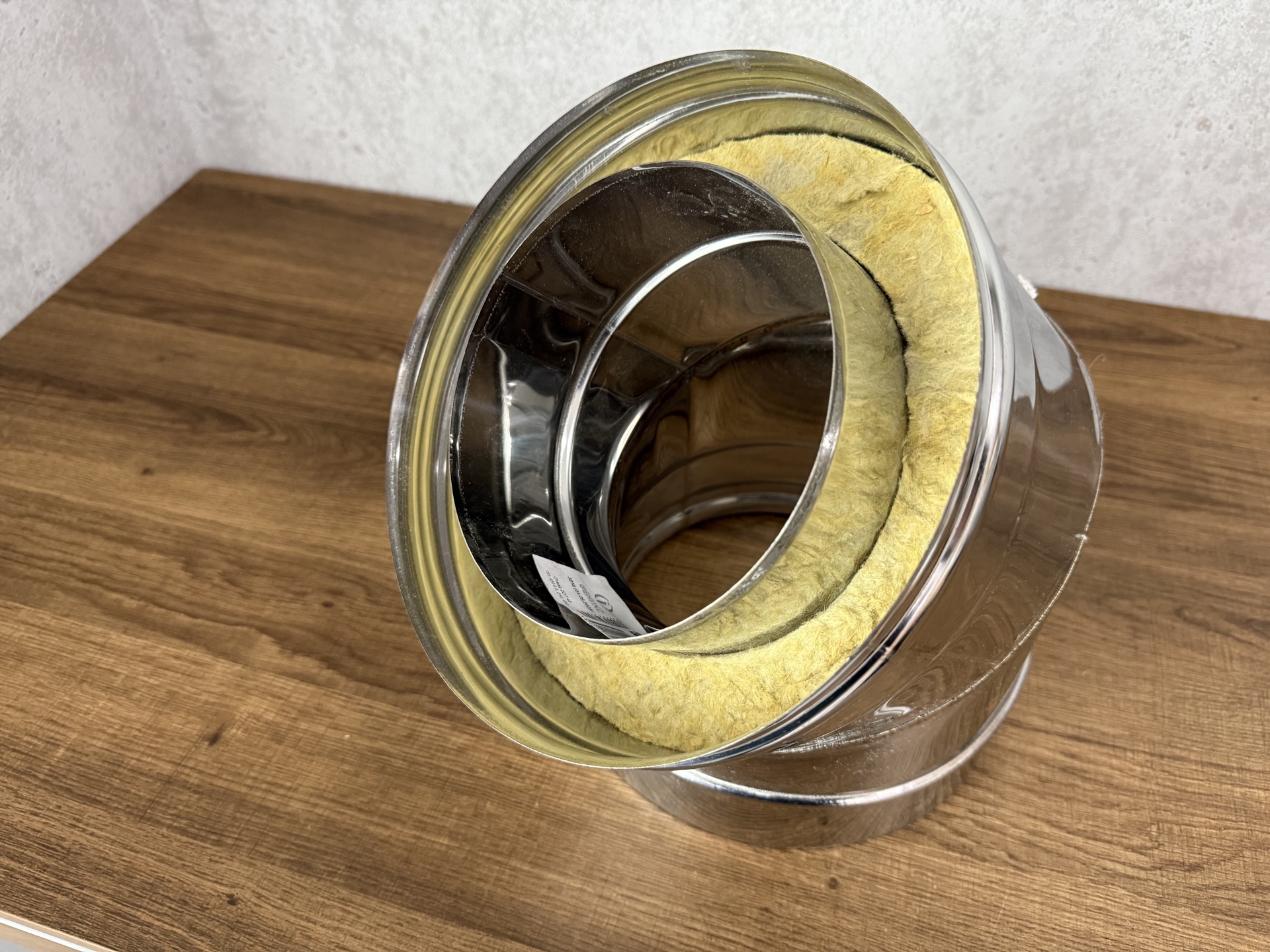 Это двухконтурный (утепленный, "сэндвич") элемент. Внутренняя труба собирается "по конденсату", а внешняя — "по дыму". Наличие теплоизоляции предотвращает быстрое охлаждение дымовых газов, что снижает образование агрессивного конденсата и повышает пожарную безопасность.