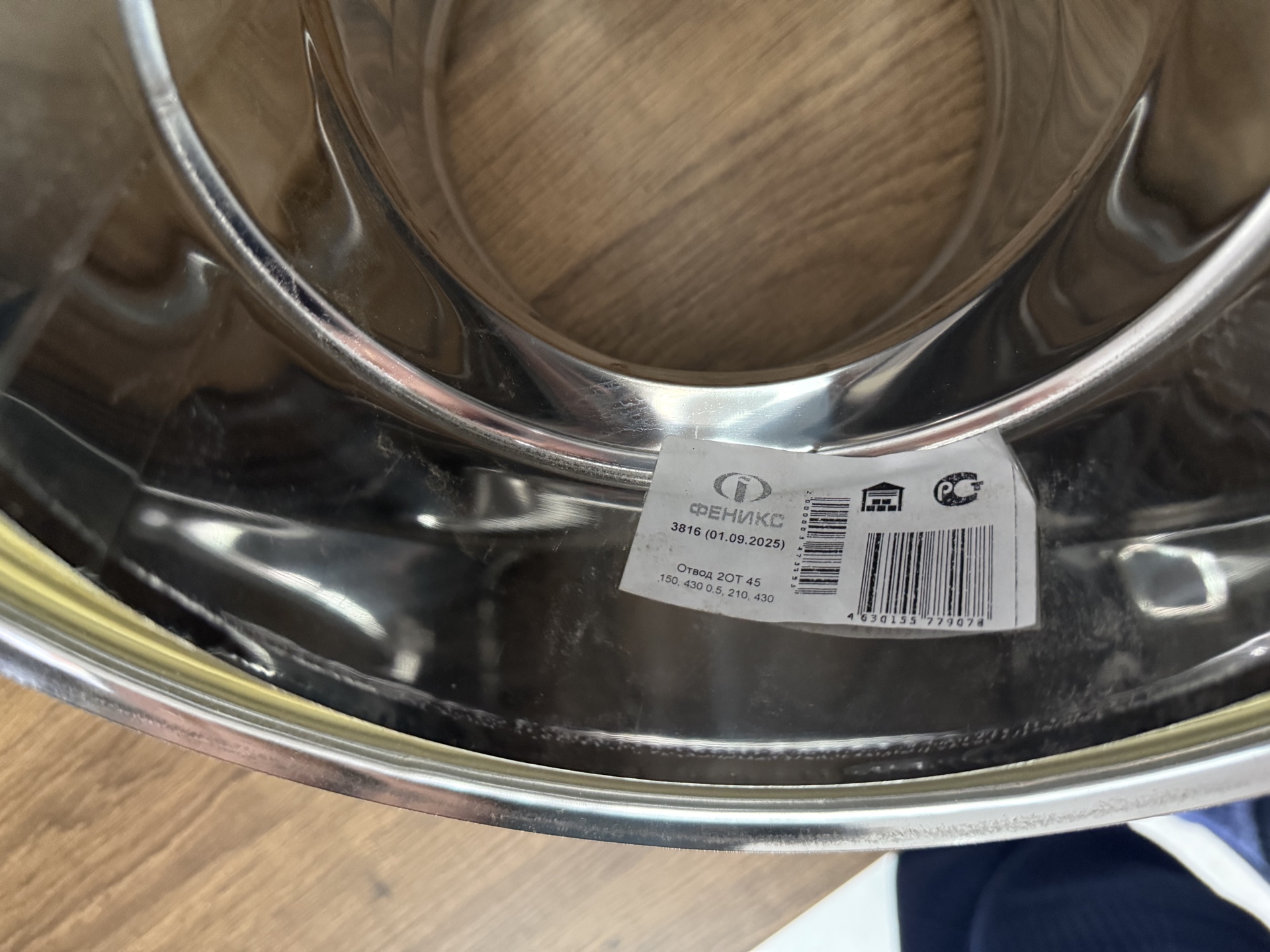 Отвод 2ОТ 45 150 / 210 мм из нержавеющей стали марки AISI 430 элемент модульной утепленной (сэндвич) системы дымохода, предназначенный для изменения направления дымовой трубы на 45° для обхода препятствий при монтаже системы отведения продуктов сгорания от котлов, печей или каминов. Он состоит из внутренней и внешней трубы с теплоизоляционным материалом толщиной 30 мм между ними.