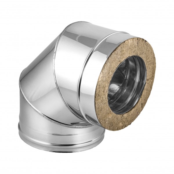Отвод 2ОТ 90 130 / 200 мм из нержавеющей стали марки AISI 430 элемент модульной утепленной (сэндвич) системы дымохода, предназначенный для изменения направления дымовой трубы на 90° для обхода препятствий при монтаже системы отведения продуктов сгорания от котлов, печей или каминов. Он состоит из внутренней и внешней трубы с теплоизоляционным материалом толщиной 30 мм между ними.