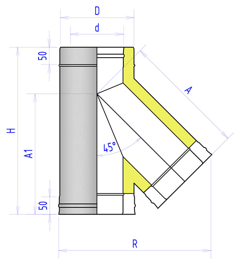 Тройник 2ТР 45 180 / 240 мм это элемент двухстенного (сэндвич) дымохода с углом отвода 45 градусов, изготовлен из нержавеющией стали марки AISI 430, толщина внутренней стенки 1 мм и наружней 0.5 мм, между внутренним и внешним контурами находится слой 30 мм изоляционного материала (негорючая базальтовая вата).
