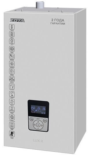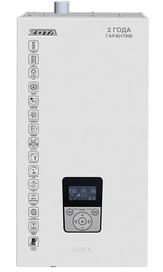 Котёл ZOTA «Lux-X» 14 — это современный настенный электрокотёл мощностью 14 кВт, предназначенный для отопления помещений площадью до 140 м² . Он относится к премиальной линейке Lux-X, отличающейся передовыми возможностями автоматизации и высокой надежностью. Модель имеет 6 ступеней мощности, реализованных с помощью двух ТЭНБ (каждый содержит три ТЭНа из нержавеющей стали) .