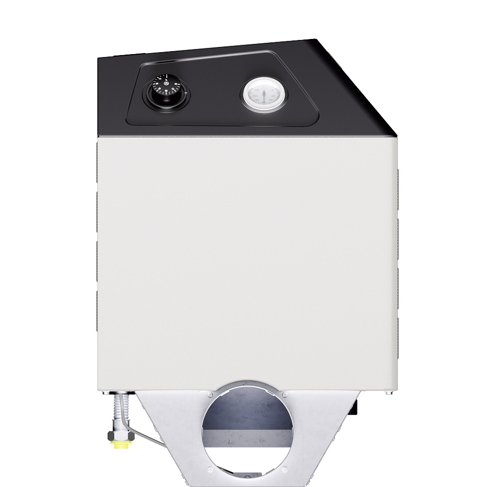 Тип камеры сгорания открытая (атмосферная). Это означает, что забор воздуха для горения осуществляется непосредственно из помещения, где установлен котел. Для отвода продуктов сгорания требуется подключение к вертикальному дымоходу с естественной тягой диаметром не менее 140 мм. Установка котла допускается только в помещениях с хорошей вентиляцией, обеспечивающей необходимый приток воздуха.