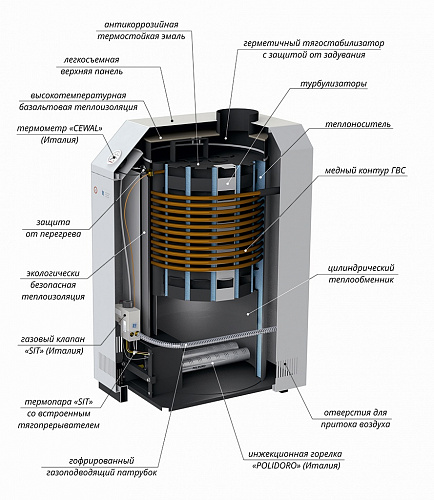 Конструкция котла представляет собой сварную конструкцию, образующую по всему периметру водяную рубашку. Теплообменник изготовлен из высококачественной стали, имеет инновационную конструкцию, теплоизоляционное покрытие и антикоррозийную обработку ингибирующим составом, что обеспечивает срок службы до 14 лет.