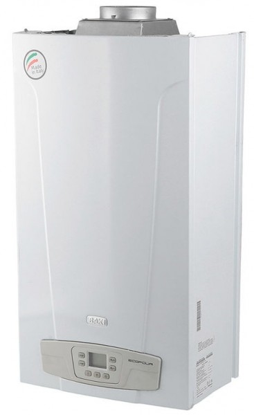 Газовый настенный котёл  BAXI ECO-4S 24 с открытой камерой сгорания (атмосферный).  Данная модель является двухконтурной, что означает наличие встроенного пластинчатого теплообменника для нагрева проточной воды, и предназначена для отопления помещений средней и большой площади и приготовления горячей воды для бытовых нужд.