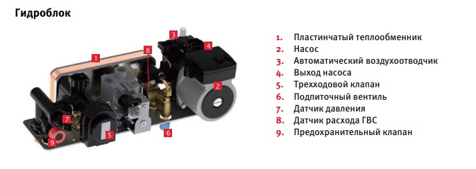 Гидравлический блок обеспечивает надежную работу всех узлов и долговечность эксплуатации. В его состав входят предохранительный клапан, датчик давления, трехходовой клапан, вторичный теплообменник, датчик расхода ГВС (аквасенсор), фильтр холодной воды и подпиточный вентиль.