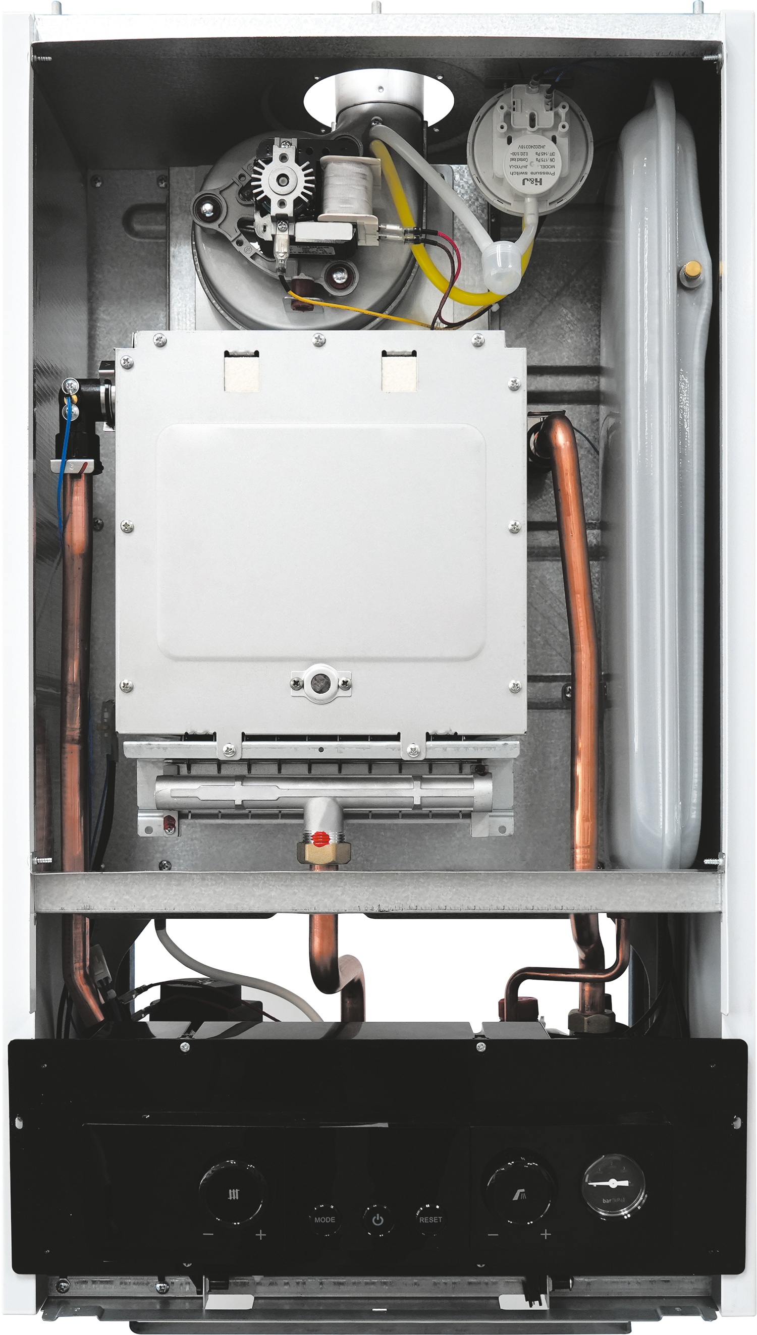 Первичный теплообменник (отопление): Оснащен теплообменником из меди. Медь обладает отличной теплопроводностью, что обеспечивает высокую эффективность теплообмена, и в то же время устойчива к коррозии. Гидравлическая группа выполнена из латуни, а соединительные трубки — из меди.