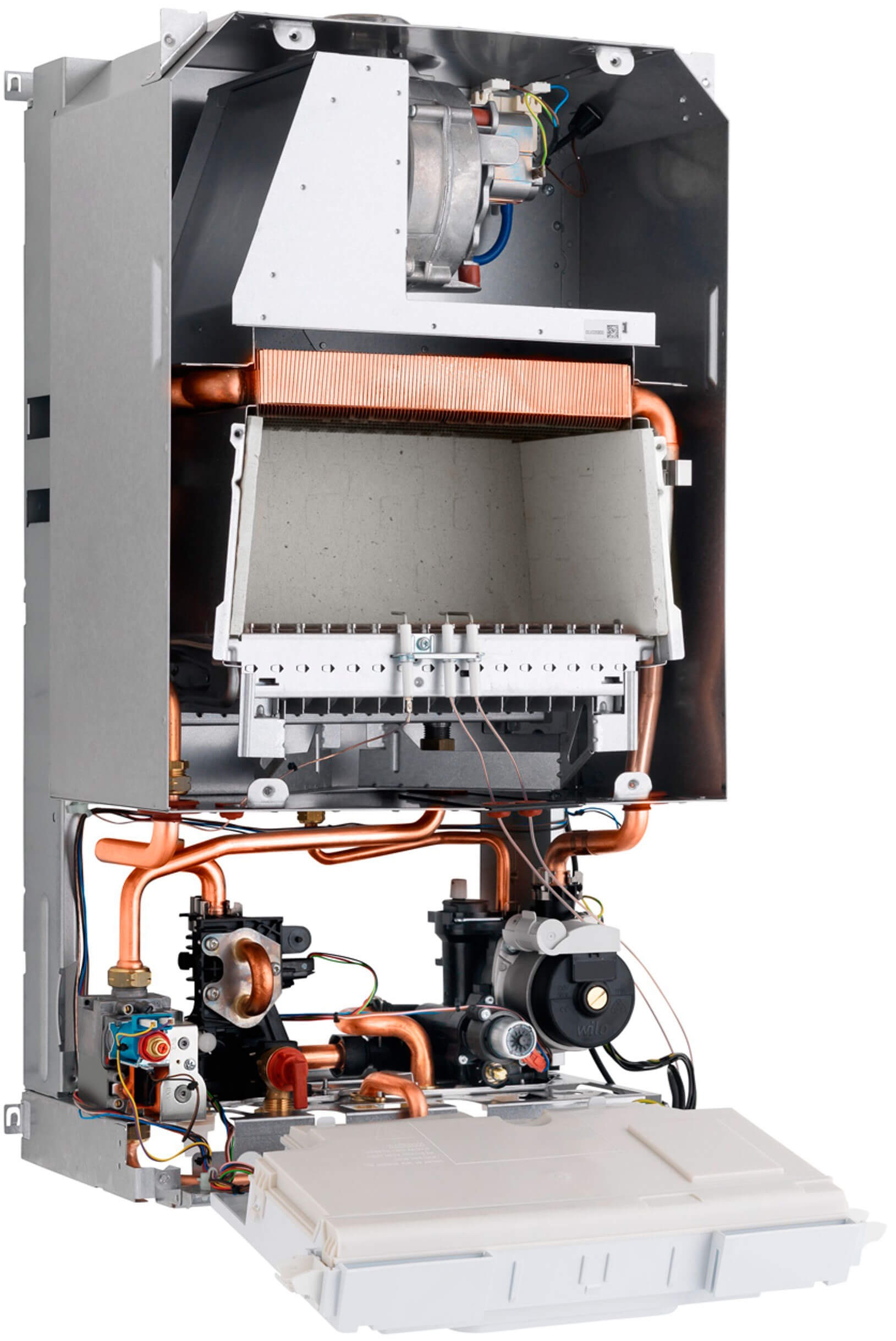 Закрытая камера сгорания (турбированная): Воздух для горения забирается с улицы через коаксиальный дымоход (60/100 мм или 80/125 мм) или раздельную систему (80/80 мм). Встроенный вентилятор принудительно удаляет продукты сгорания. Это позволяет устанавливать котел без традиционного дымохода в любом помещении.