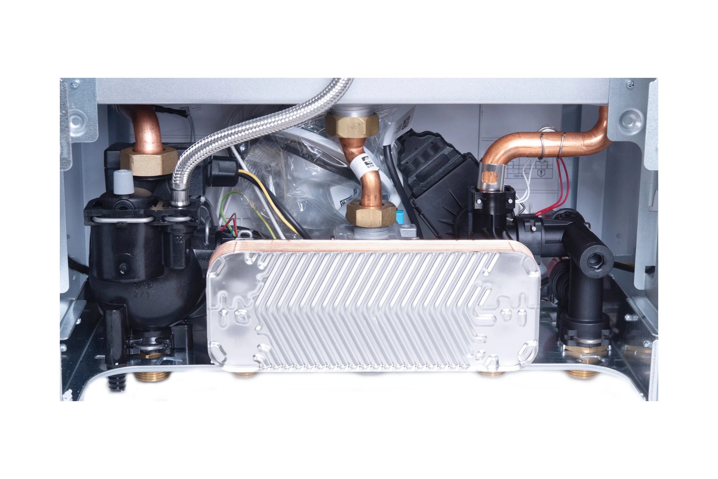 Первичный теплообменник выполнен из меди, что обеспечивает отличную теплопередачу, высокую устойчивость к коррозии и долговечность работы отопительного контура.
