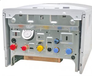 Гидравлический блок объединяет основные элементы: предохранительный клапан, датчик давления, приоритетный переключающий клапан, погружной датчик температуры, вторичный теплообменник, датчик расхода (турбину), быстродействующий воздухоотводчик, насос системы отопления и газовую арматуру.