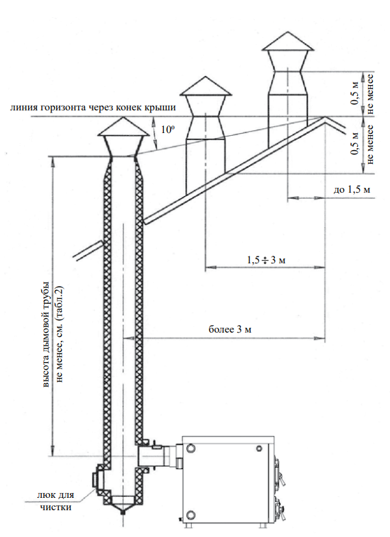 Диаметр дымохода. Патрубок дымохода имеет диаметр 120 мм. Рекомендуемая минимальная высота дымохода – 6 м (при разряжении 6–65 Па в зависимости от конструкции). Дымоход должен быть отдельным, использование вентиляционных каналов запрещено. Рекомендуются дымовые трубы из нержавеющей стали с утеплителем. Запрещается использование кирпичного дымохода без гильзы. Длина горизонтального участка при выходе через стену не должна превышать 1,5 м. При прохождении через деревянные перекрытия зазор до конструкций – не менее 380 мм, заполняется жаропрочным утеплителем.