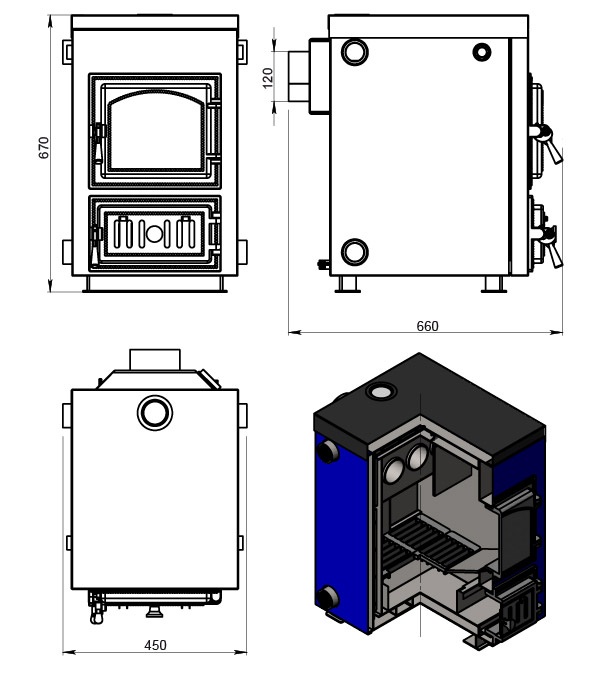 Конструкция топочного пространства. Топка оснащена чугунными колосниками, через которые подается первичный воздух. Под колосниками расположен зольный ящик для сбора золы и шлака. Для чистки теплообменника предусмотрена загрузочная дверца, через которую можно получить доступ к поверхностям нагрева. Для прочистки колосников и удаления золы используется поддувальная дверца.