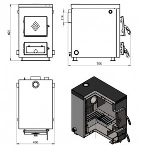 Конструкция топочного пространства. Топка оснащена чугунными колосниками, через которые подается первичный воздух. Под колосниками расположен зольный ящик для сбора золы и шлака. Для чистки теплообменника предусмотрена загрузочная дверца, через которую можно получить доступ к поверхностям нагрева. Для прочистки колосников и удаления золы используется поддувальная дверца.