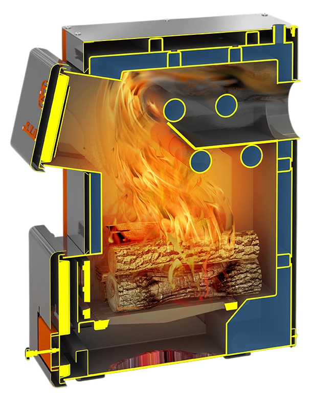 Конструкция топочного пространства. Внутри топочного канала установлена чугунная створка котла, защищающая от просыпания горящего топлива при открывании дверцы. Через отверстия в створке можно осуществлять шуровку топлива без риска выпадения углей. За дверцей прочистной/загрузочной расположен лоток, который в открытом состоянии облегчает загрузку топлива, а в закрытом служит пламяотбойником, защищающим дверцу.