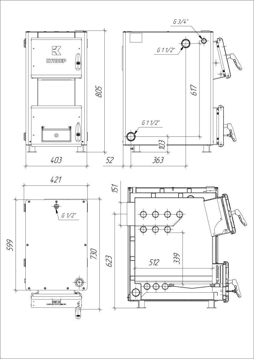 Регулятор тяги и автоматика подачи воздуха. Для стабилизации тяги и оптимизации подачи воздуха в топочную камеру может быть установлен регулятор тяги (штуцер G3/4″), который позволяет сократить расход топлива до 20% и точнее поддерживать температуру теплоносителя. Также возможна установка вентилятора наддува или дымососа для принудительной подачи воздуха, что повышает КПД и экономит до 30% топлива.