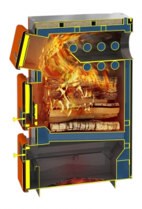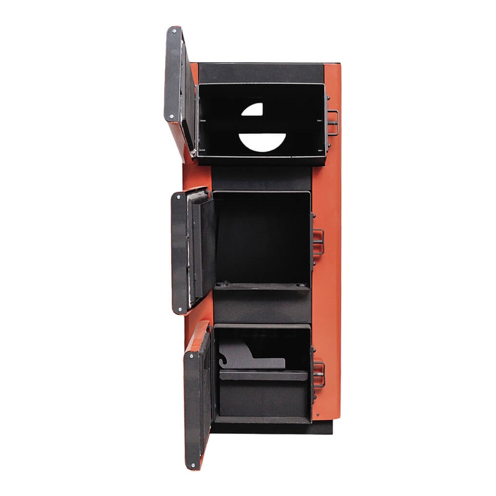 Дверцы котла. Котел оснащен тремя дверцами: зольной, топочной и прочистной-загрузочной. Зольная дверца обеспечивает доступ к зольному ящику и содержит заслонку первичного воздуха. Топочная дверца оснащена экраном, защищающим от жара и нагревающим вторичный воздух. Прочистная дверца обеспечивает доступ к трубам теплообменника для удаления сажи и может использоваться для дополнительной загрузки топлива.