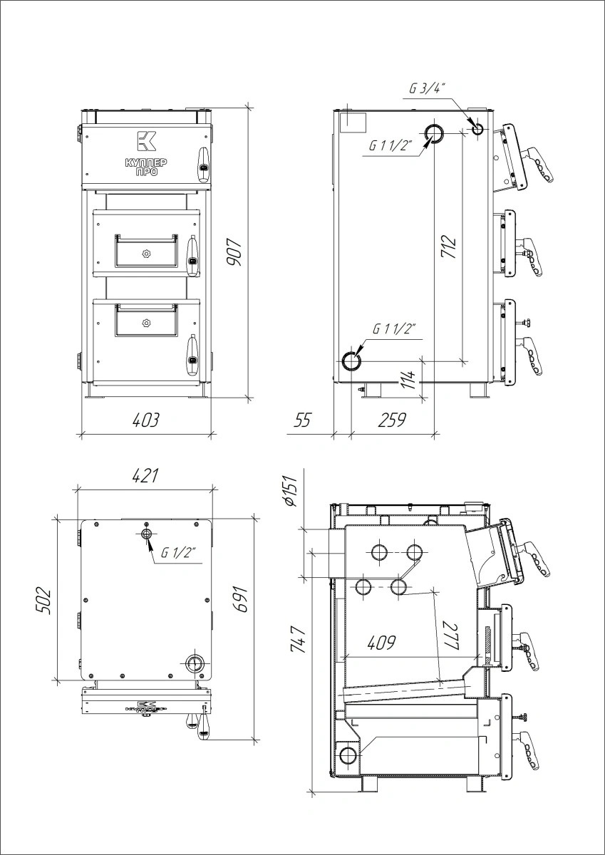 Диаметр дымохода. Для модели Куппер ПРО 16 (2.0) диаметр дымоходного патрубка составляет 150 мм. Рекомендуемая высота дымохода от колосниковой решетки – не менее 5 м. Дымоход должен быть отдельным, использование вентиляционных каналов для отвода продуктов сгорания запрещено. Для котлов с газовой горелкой необходимо применять газоплотный дымоход из сварных нержавеющих труб с герметичным уплотнением стыков.