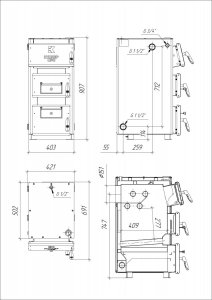 Конструкция топочного пространства. Внутри топочного канала установлена чугунная створка котла, защищающая от выпадения горящего топлива при открывании дверцы. Через отверстия в створке можно осуществлять шуровку топлива без риска выпадения углей. За дверцей прочистной расположен лоток, который в открытом состоянии облегчает загрузку топлива, а в закрытом служит пламяотбойником, защищающим дверцу от прямого воздействия пламени.