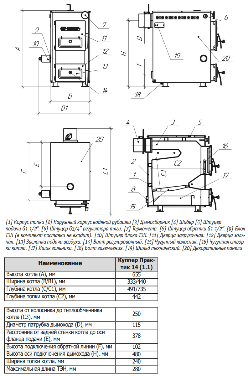 Диаметр дымохода. Для модели Куппер ПРАКТИК-14 (1.1) диаметр дымоходного патрубка составляет 115 мм. Рекомендуемая высота дымохода от колосниковой решетки – не менее 5 м. Дымоход должен быть отдельным, использование вентиляционных каналов запрещено. Рекомендуются двустенные модульные дымоходы типа «сэндвич» из нержавеющей стали толщиной не менее 0,8 мм (марки AISI 430/439/304). Запрещается использование кирпичного дымохода.