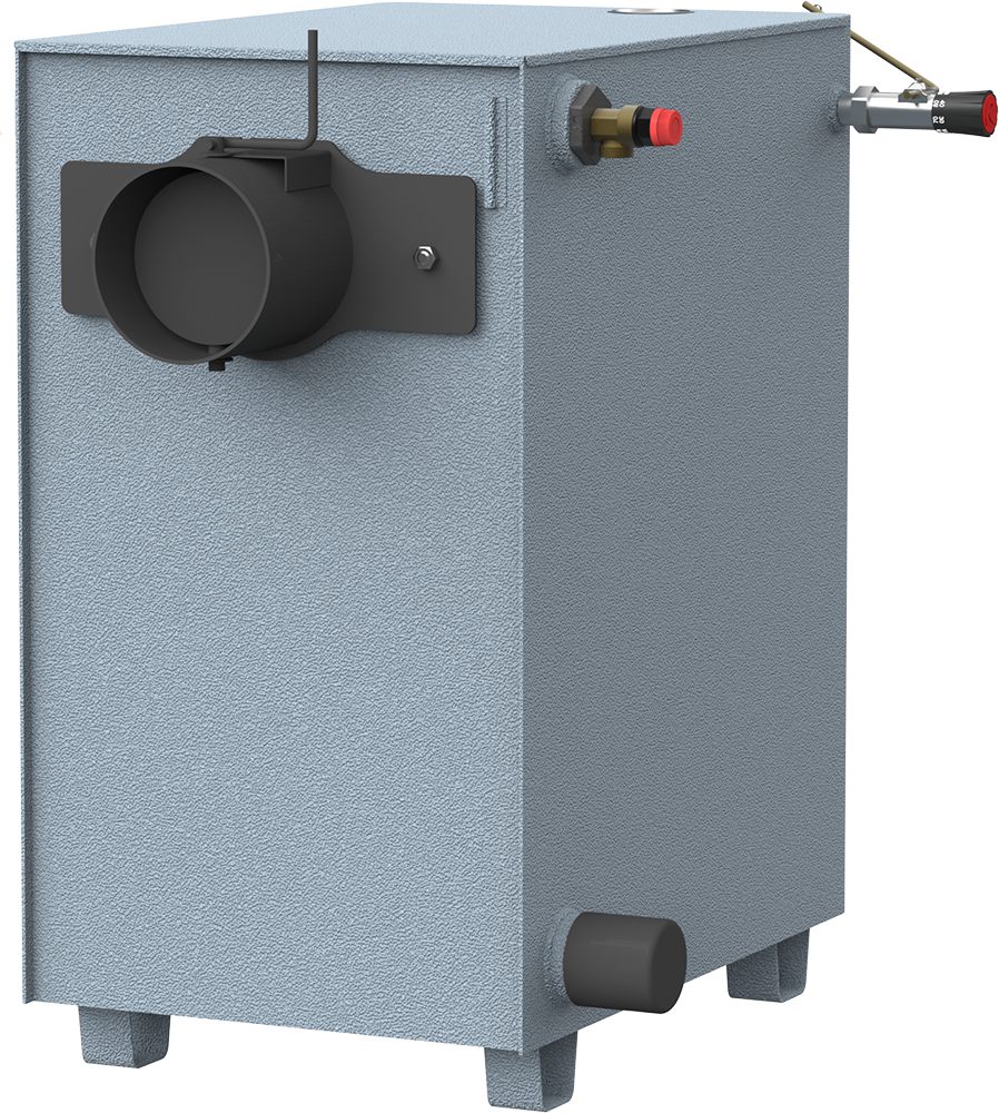 Дымоход. В базовой комплектации котёл оснащён съёмным горизонтальным дымоходом круглого сечения КГ 2 с шибером, диаметр присоединяемого дымохода – 150 мм. Дымоход подключается к задней стенке котла. Конструкция позволяет использовать другие съёмные дымоходы (доп. комплектация): горизонтальный прямоугольный ПГ 2 (для подключения к кирпичной трубе) и вертикальный круглый КВ 2 (для подключения к круглой вертикальной стальной трубе). Площадь сечения кирпичного дымохода должна быть не менее 325 см². Высота дымохода от уровня колосников – не менее 6 м. Требуемое разрежение в дымоходе – 10…25 Па. Для герметизации стыков используется термостойкий шнур.