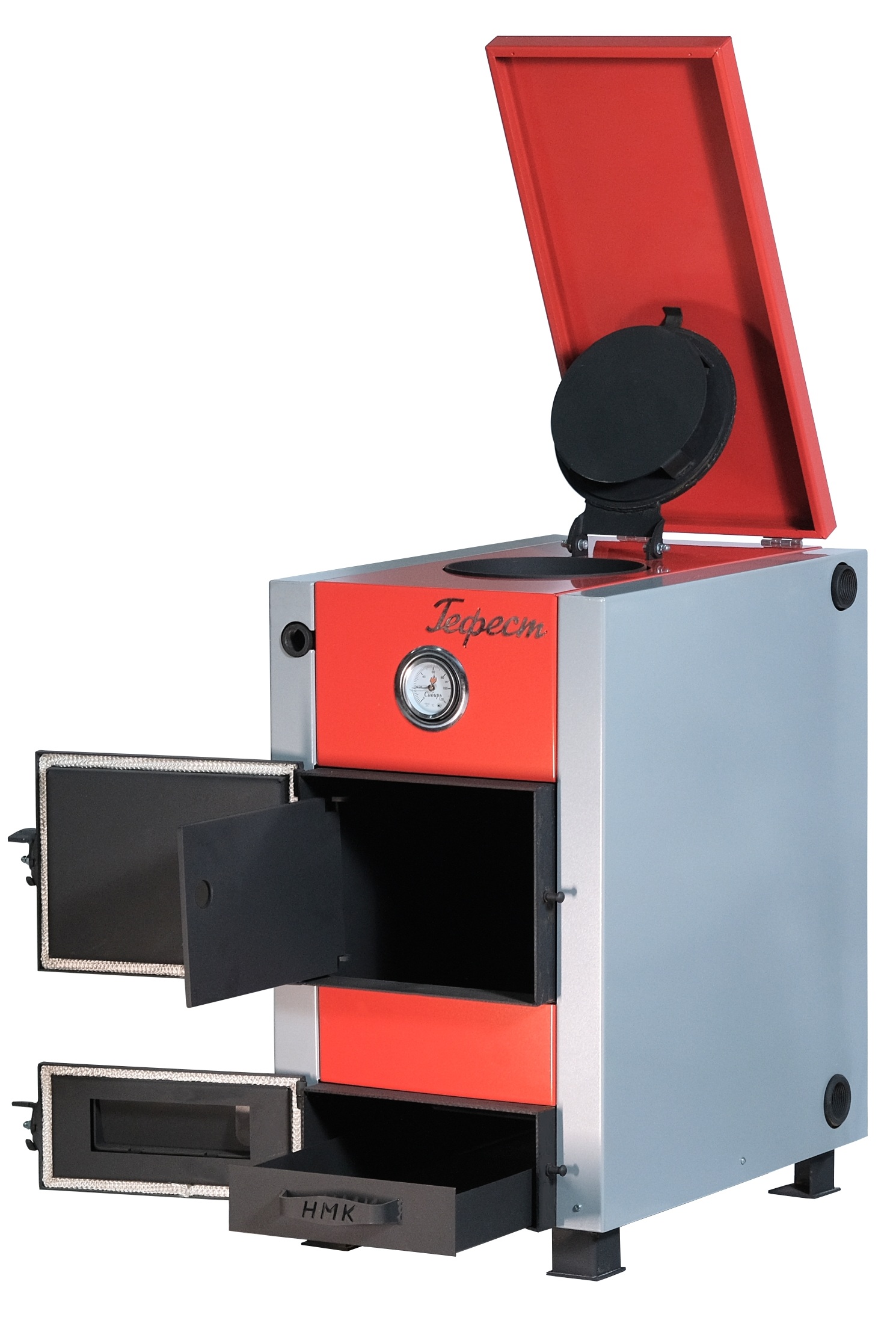 Твердотопливный стальной водогрейный напольный котёл НМК СИБИРЬ-ГЕФЕСТ 15 кВт, это энергонезависимое (при работе на твёрдом топливе) отопительное оборудование с возможностью подключения электрического ТЭНа в качестве резервного источника тепла. Котёл имеет цельносварной корпус из котловой стали толщиной 3 мм по ГОСТ 5520-79, покрытый термостойкой эмалью (выдерживает до 800 °С). Теплонагруженные части корпуса обеспечивают высокую надёжность. Предназначен для систем водяного отопления с естественной или принудительной циркуляцией в индивидуальных жилых домах и зданиях коммунально-бытового назначения. Основное топливо – все виды угля, дрова; электричество используется как резервное топливо. Котёл соответствует ТУ 4931-00438819949-2013, имеет международный сертификат соответствия.