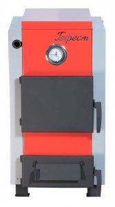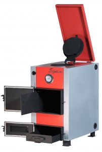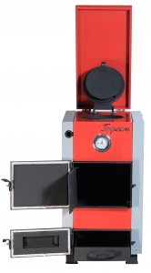 Конструкция топочного пространства. Корпус цельносварной, с водяной рубашкой и водонаполненными теплообменниками. В топке установлены водонаполненный треугольный колосник и чугунный колосник, что улучшает теплообмен и повышает КПД. Водонаполненные трубы теплообменника также участвуют в отводе тепла. В верхней части топки расположен отбойник. Под колосниками находится зольная камера с выдвижным зольным ящиком. Корпус облицован кожухом, сверху установлена крышка.