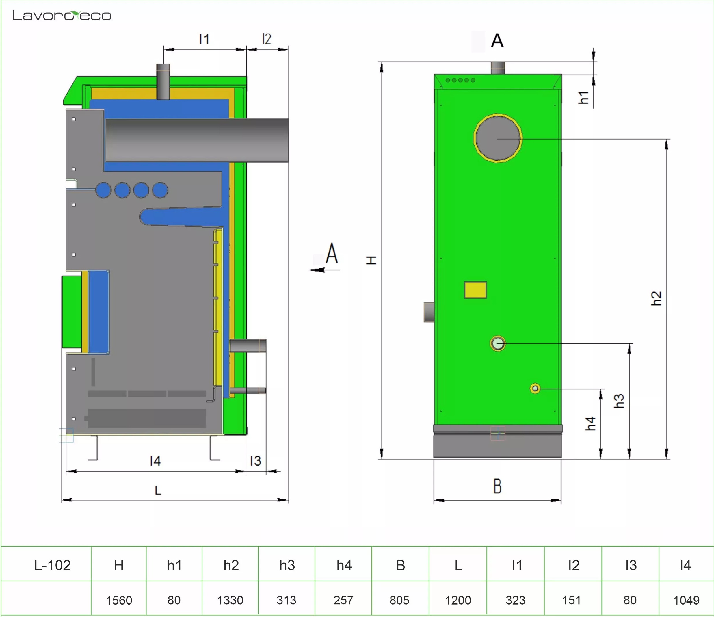 Твердотопливный напольный котел LAVORO ECO L-102 это энергозависимое (полуавтоматическое) отопительное оборудование с водяной рубашкой из специальной котловой стали 09Г2С толщиной 5 мм, предназначенное для отопления жилых и общественных помещений площадью от 500 до 1000 м². Модель является самой мощной в серии L, оснащена контроллером ECO100 и дутьевым вентилятором для автоматического поддержания горения, что обеспечивает высокий КПД и длительную работу на одной закладке дров.