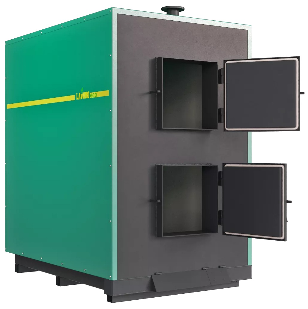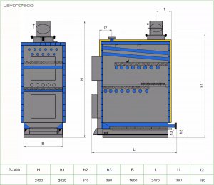 Твердотопливный стальной водогрейный напольный котёл LAVORO PRO P-300, это энергонезависимое отопительное оборудование с водяной рубашкой из специальной котловой стали 09Г2С, предназначенное для систем водяного отопления закрытых помещений (жилых, общественных, производственных) с естественной или принудительной циркуляцией в умеренных и холодных климатических зонах. Модель является трёхходовым пиролизным котлом с газификацией древесины и функцией дожига пиролизных газов (длительного горения), оснащена механическим регулятором тяги FR124 и термоманометром для визуального контроля температуры и давления. Основное топливо – дрова, возможно использование торфа, брикетов и угля. Котёл соответствует ТУ 4931-001-69922782-2012, климатическое исполнение УХЛ4.2 по ГОСТ 15150.