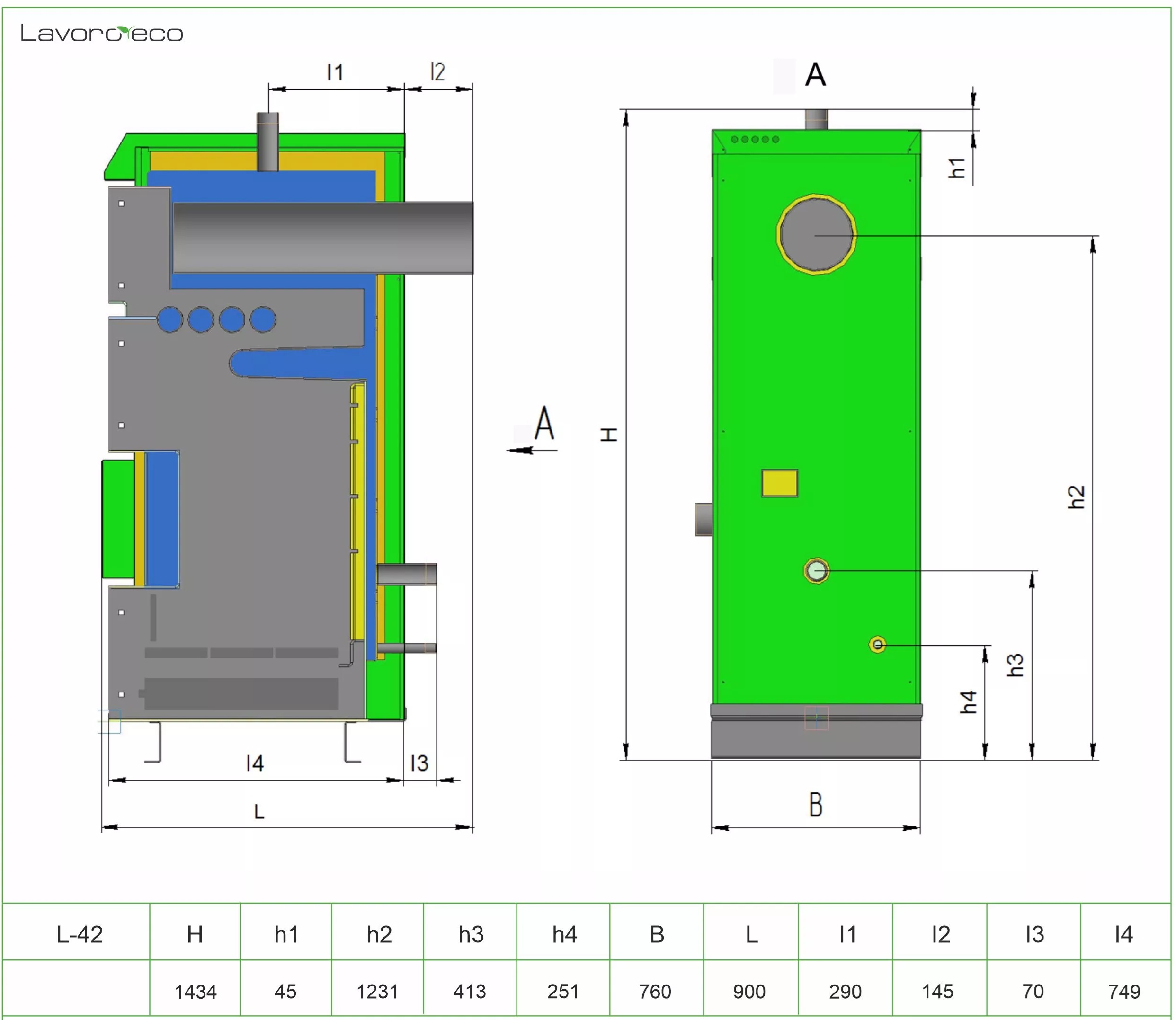 Твердотопливный напольный котел LAVORO ECO L-42 это энергозависимое (полуавтоматическое) отопительное оборудование с водяной рубашкой из специальной котловой стали 09Г2С толщиной 5 мм, предназначенное для отопления жилых и общественных помещений площадью от 150 до 400 м². Модель относится к серии L, оснащена контроллером ECO100 и дутьевым вентилятором для автоматического поддержания горения, что обеспечивает высокий КПД и длительную работу на одной закладке дров.