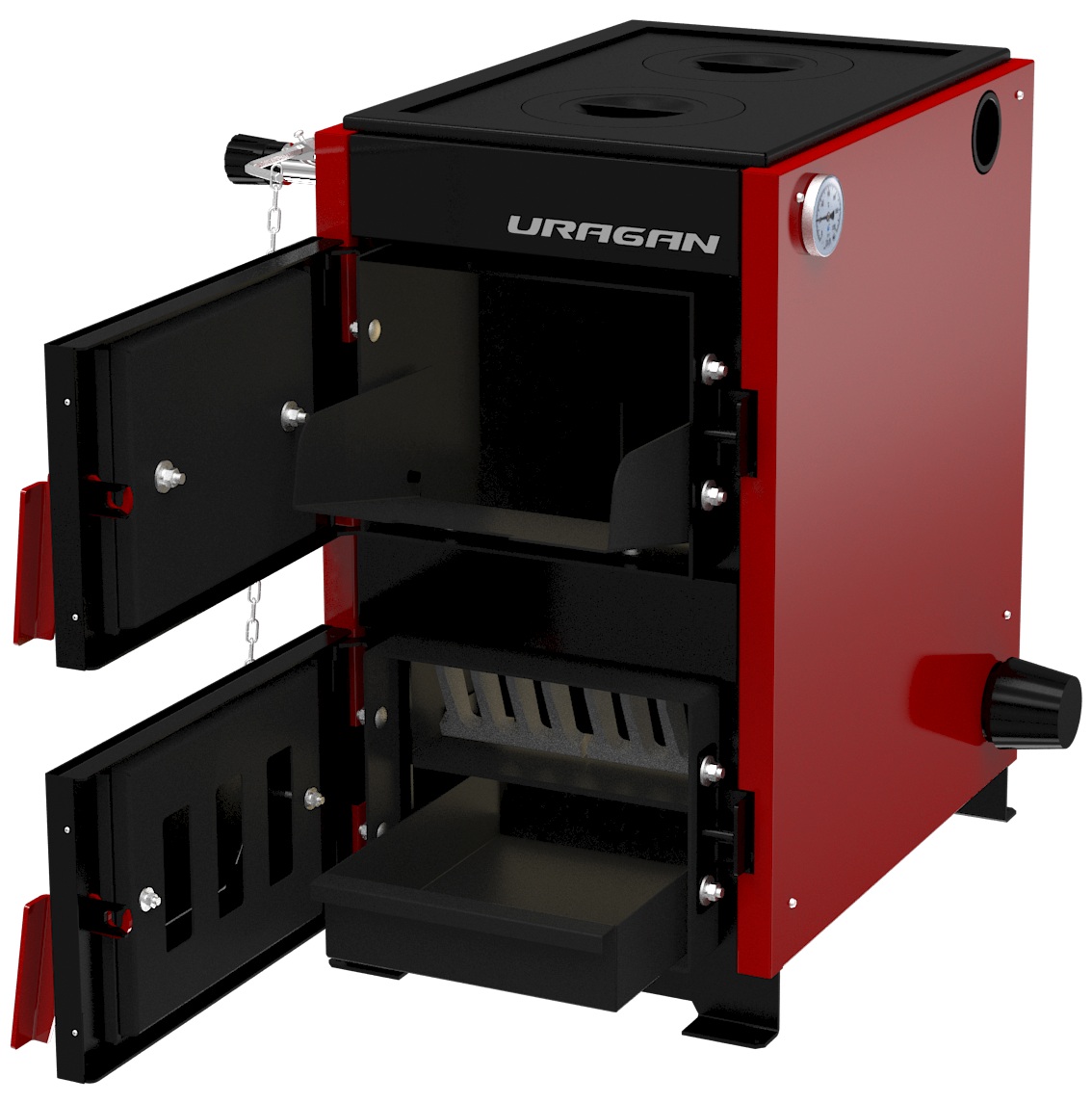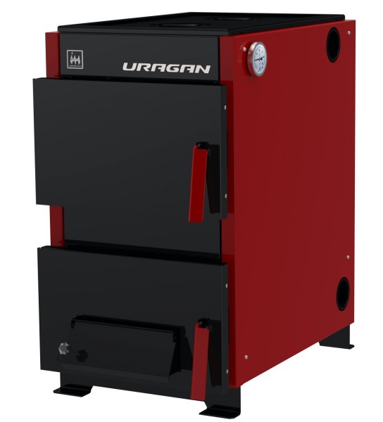 Твердотопливный напольный котел ТЕРМОКРАФТ URAGAN («Ураган») 16 кВт, это энергонезависимое отопительное оборудование с водяной рубашкой из конструкционной стали толщиной 3 мм, предназначенное для отопления индивидуальных жилых домов и зданий коммунально-бытового назначения площадью от 120 до 160 м². Модель оснащена варочной плитой с двумя чугунными конфорками, системой активного дымоудаления, загрузочным лотком для угля, наклонными передними колосниками и может работать как в открытых, так и в закрытых системах водяного отопления с принудительной или естественной циркуляцией. Продолжительность работы на одной загрузке в режиме поддержания достигает 12 часов.