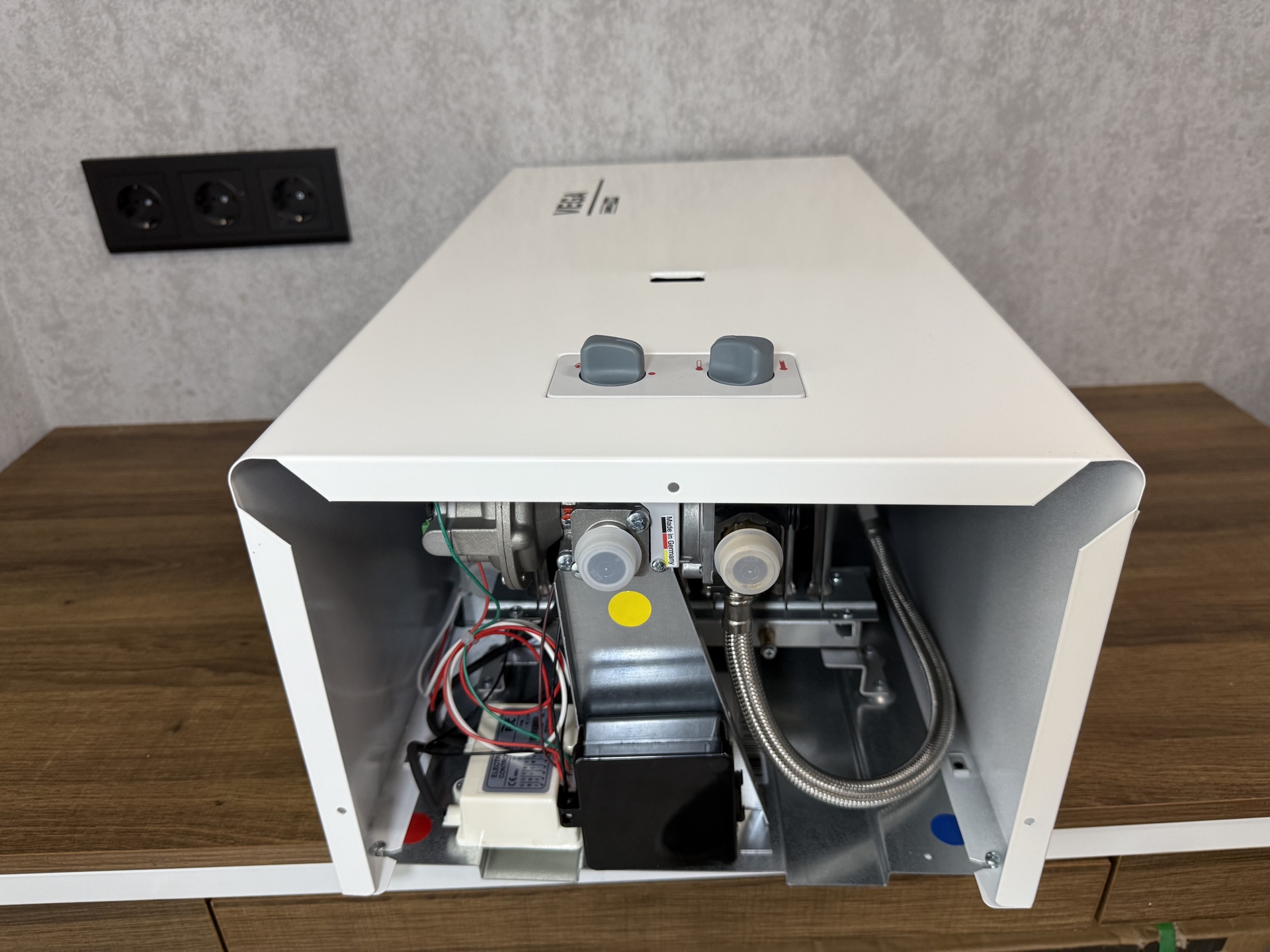 Розжиг полностью автоматизирован и не требует ручного зажигания фитиля. Пламя загорается автоматически при открытии крана горячей воды.