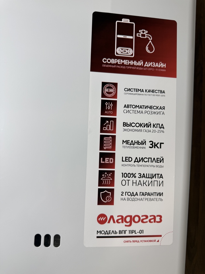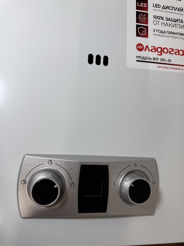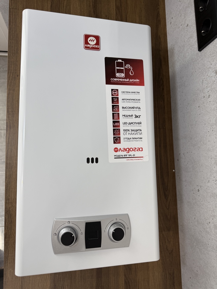 Газовая колонка Ладогаз ВПГ-11PL-01 мощностью 16,95 кВт (11 л/мин) с открытой камерой сгорания и автоматическим электронным розжигом от батареек, разработанный для бытового использования. Модель отличается медным теплообменником с защитой от накипи, работой при низком давлении воды, наличием LCD-дисплея и энергосберегающими технологиями.