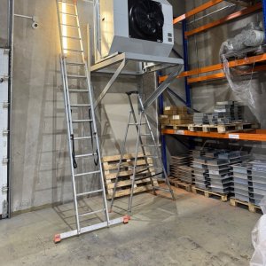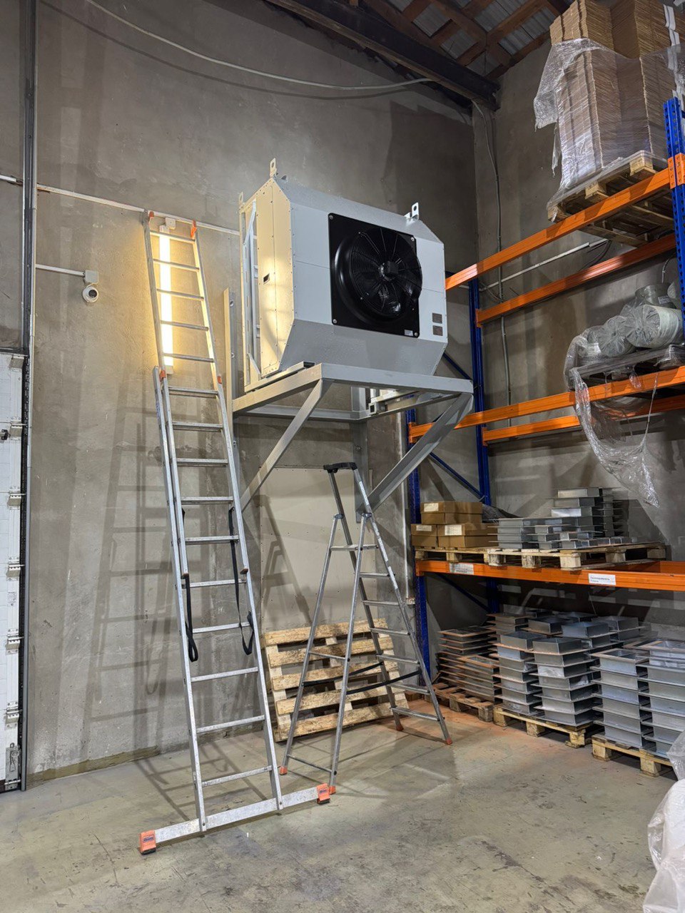 Монтаж выносного конденсатора внутри цеха (под перекрытием/на кронштейнах) с учетом обеспечения достаточного воздухообмена для отвода тепла.