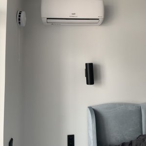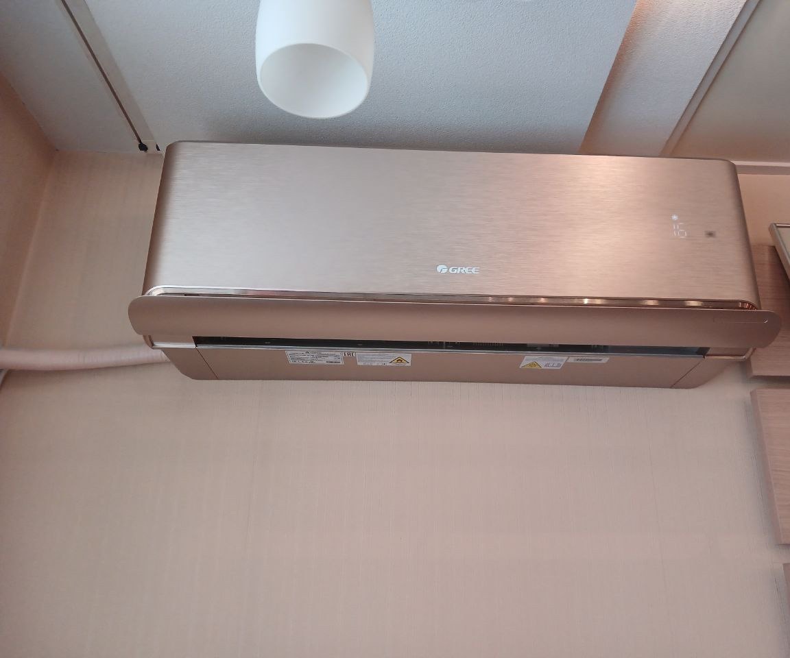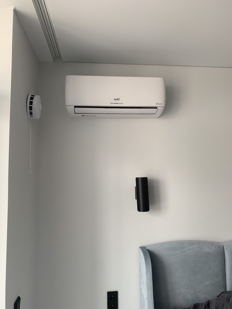 Результат: Пожелания клиента были выполнены в полном объеме: Цвет шампань идеально вписался в интерьер, а стилизация коммуникаций термолентой сохранила безупречный вид стен. Ионизатор воздуха обеспечивает постоянную очистку и свежесть, что особенно важно для спальни и зоны отдыха. Интеграция в умный дом сделала управление кондиционером максимально комфортным и современным.