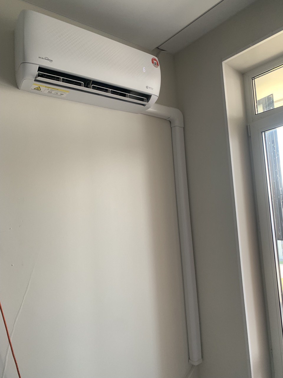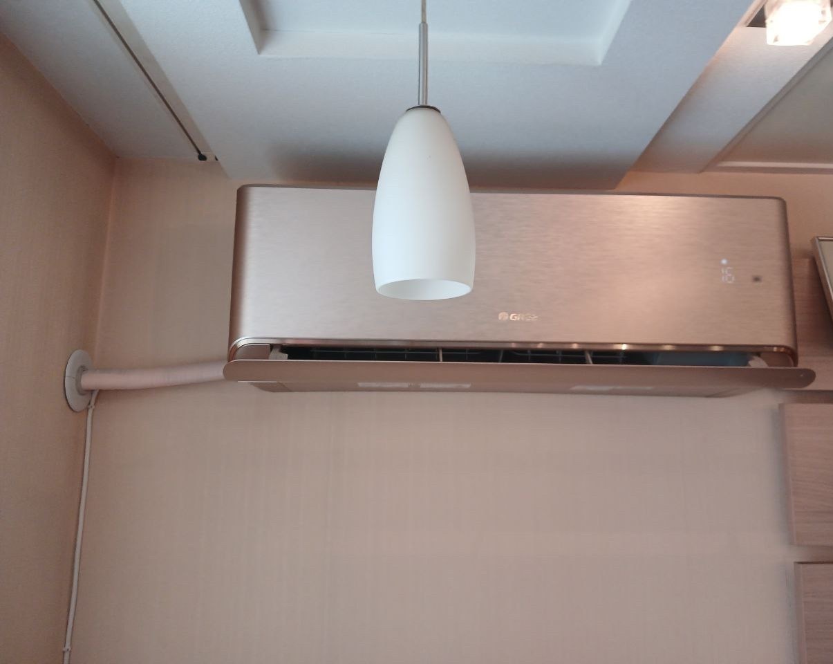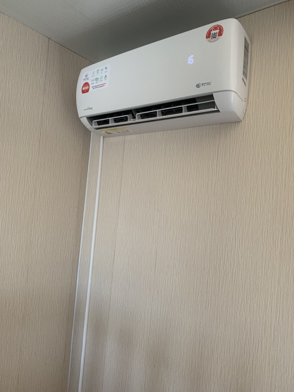 Чтобы сохранить эстетику интерьера и подчеркнуть изящный цвет шампань внутреннего блока, было принято решение не использовать стандартный пластиковый кабель-канал. Вместо этого трубы и провода были аккуратно задекорированы специальной термоусадочной лентой, подобранной тон в тон к цвету стен. Такое решение сделало коммуникации менее незаметными, позволив кондиционеру стать стильным акцентом, а не техническим элементом.