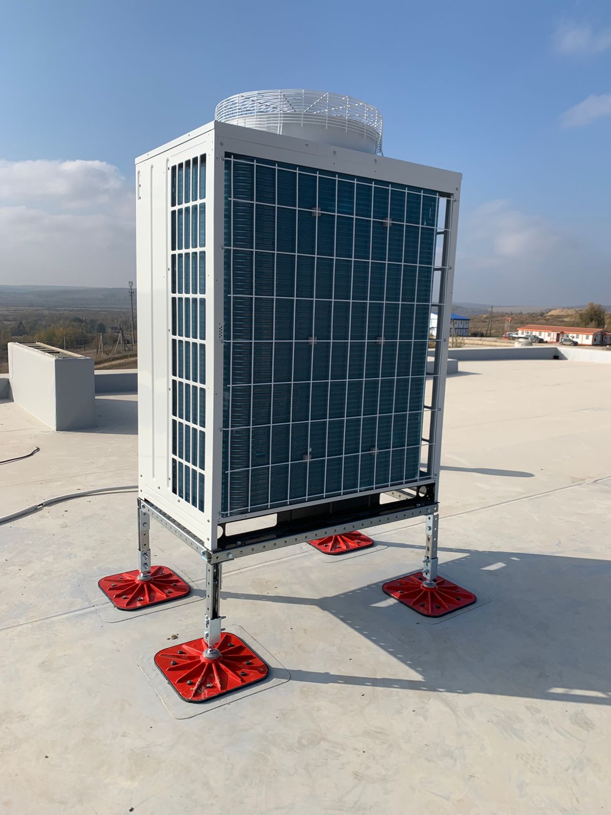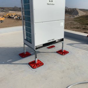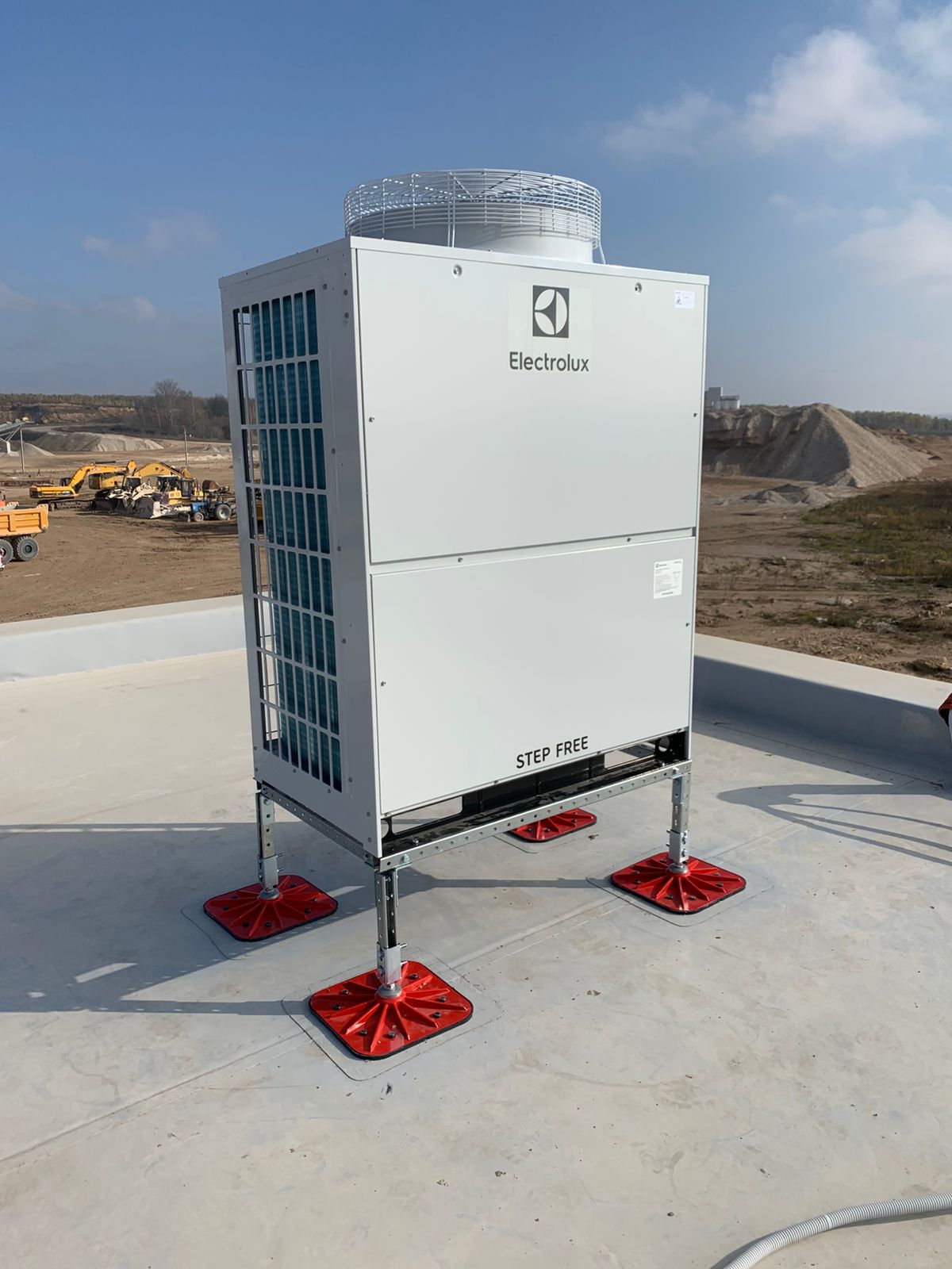 Монтаж наружного блока: установлен внешний модуль Electrolux ESVMO-SF-400-A (холодопроизводительность 40 кВт, теплопроизводительность 45 кВт) на специальные подставки для мягкой кровли. Благодаря технологии Hybrid Inverter&Digital и модульной конструкции обеспечена высокая энергоэффективность и адаптация к перепадам напряжения в сельской сети . Теплообменник Blue Fin гарантирует защиту от коррозии в условиях повышенной влажности и запылённости .